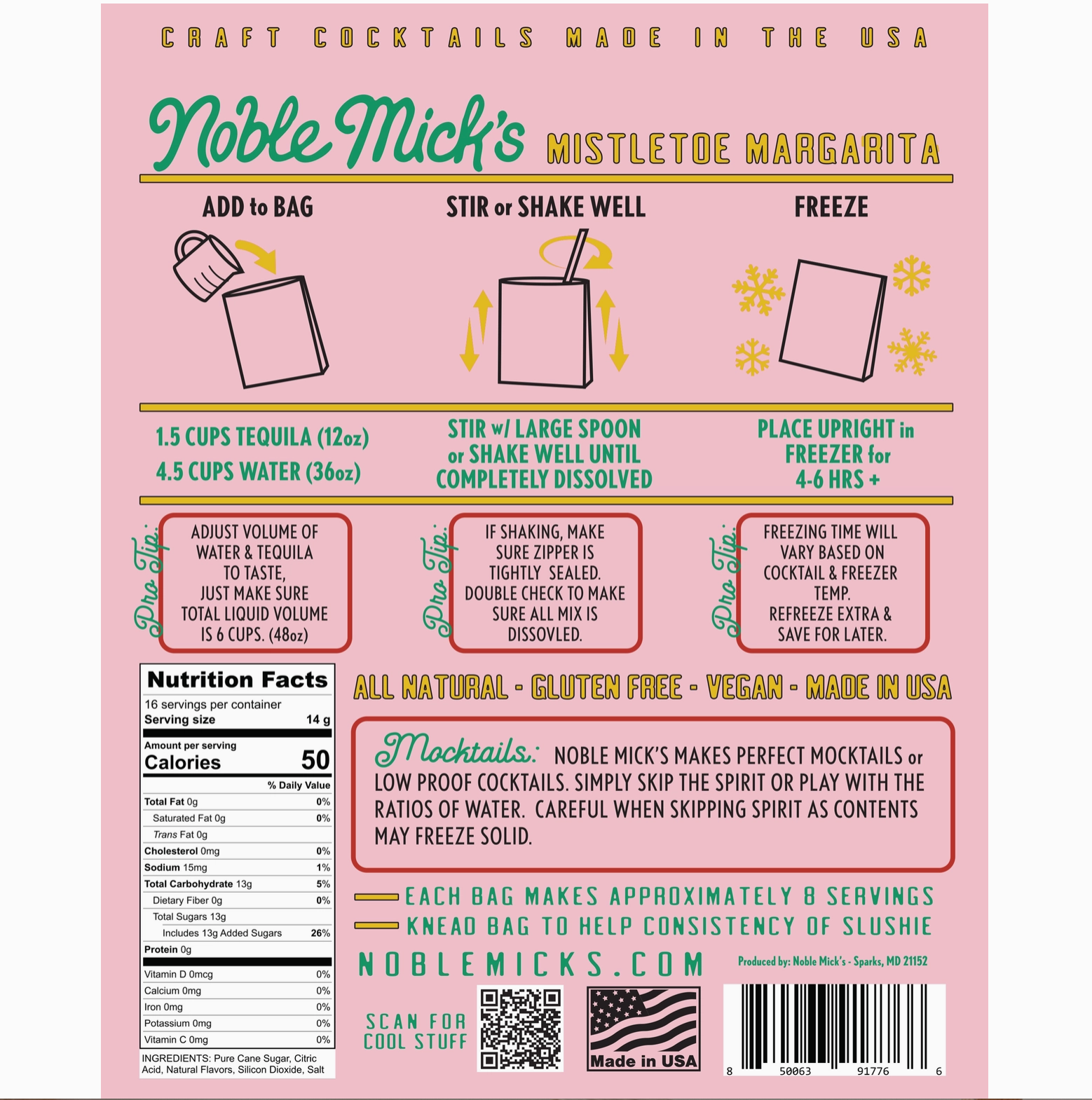 Frozen Cocktails don't get easier than this! Each bag makes 8 servings. No blenders ever! Simply add 1.5 cups of tequila and 4.5 cups of water (total 6 cups of liquid), shake or stir and throw in the freezer. Then serve right from the bag. Our Frozen cocktails are unique in you ONLY ever add water and spirit...NEVER any juice, mixers or additional flavors. That's one of the things that sets us apart. 100% all natural ingredients and perfect to share with friends and family at your next party.