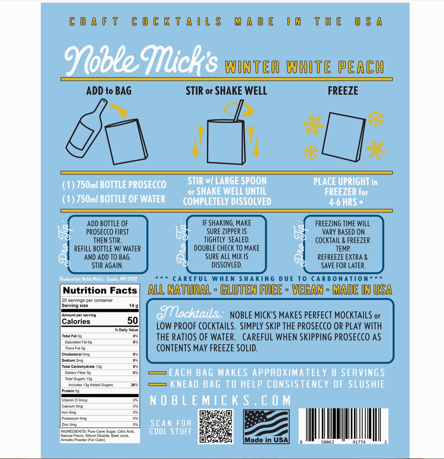 Frozen Cocktails don't get easier than this! Each bag makes 8 servings. No blenders ever! Simply add 1.5 cups of tequila and 4.5 cups of water (total 6 cups of liquid), shake or stir and throw in the freezer. Then serve right from the bag. Our Frozen cocktails are unique in you ONLY ever add water and spirit...NEVER any juice, mixers or additional flavors. That's one of the things that sets us apart. 100% all natural ingredients and perfect to share with friends and family at your next party.