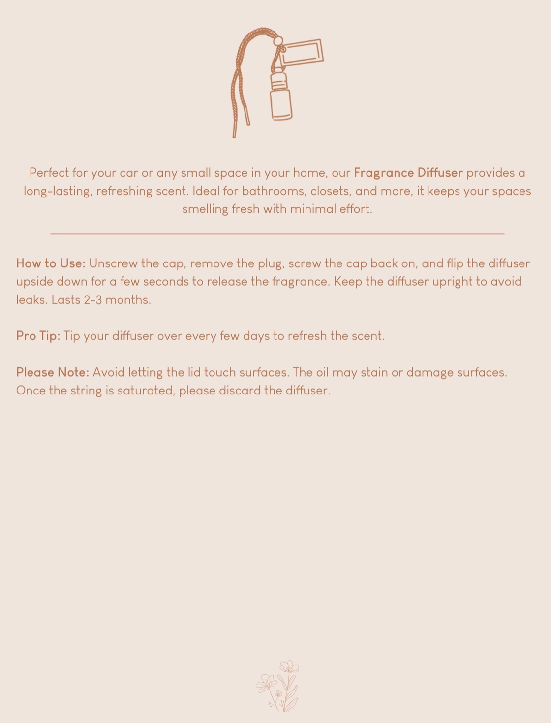 Vanilla beans with sweet apple, bergamot, blonde woods and sensual musk. vanilla bean - sweet apple - bergamot - musk Perfect for your car or any small space in your home, our Fragrance Diffuser provides a long-lasting, refreshing scent. Ideal for bathrooms, closets, and more, it keeps your spaces smelling fresh with minimal effort.