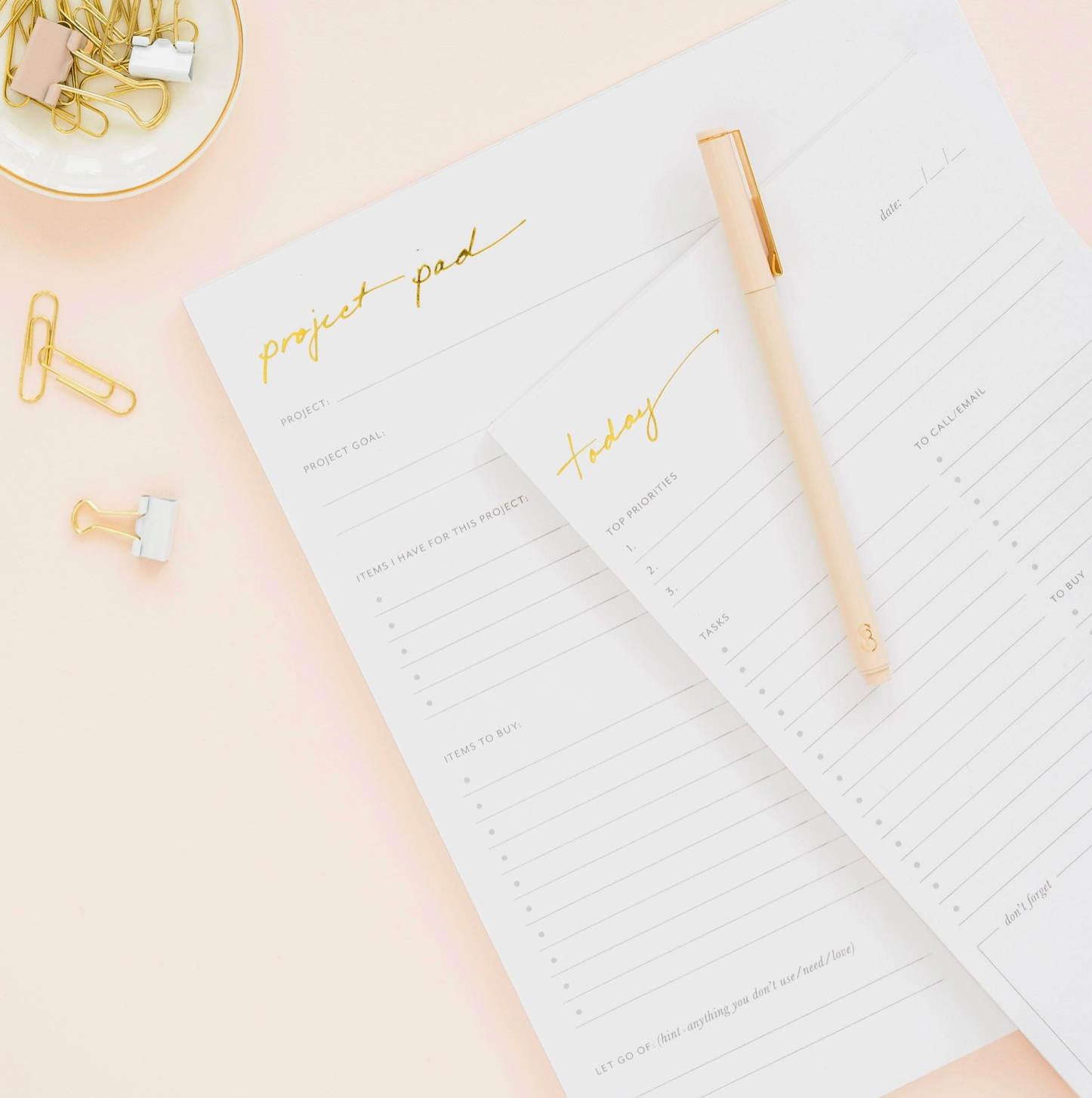 No task too tall. The Breathing Room x Sugar Paper Today Pad brings a sense of simplicity to even the busiest of days with its clean, streamlined daily notepad layout that keeps track of tasks, activities, correspondence, and more with a classic white paper with gold foil detail that we love.